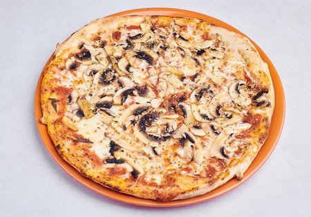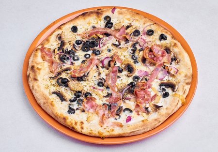 Sos czosnkowy, mozzarella fior di latte, boczek pancetta, pieczarki, cebula, czarne oliwki