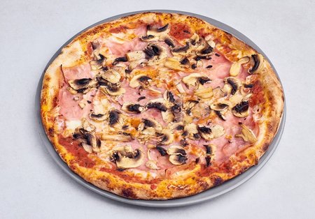 Sos pomidorowy, mozzarella fior di latte szynka cotto, pieczarki