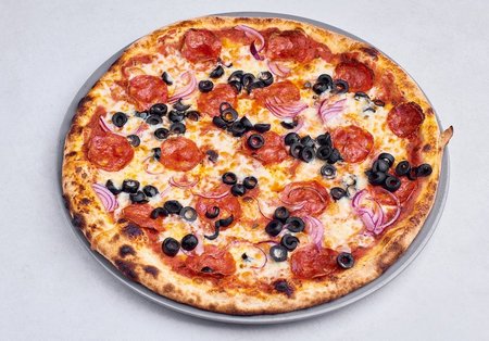 Sos pomidorowy, mozzarella fior di salami napoli, cebula, czarne oliwki