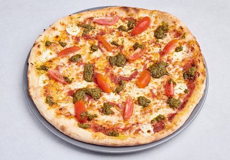 Sos pomidorowy, mozzarella fior di latte, pomidorki cherry, pesto bazyliowe