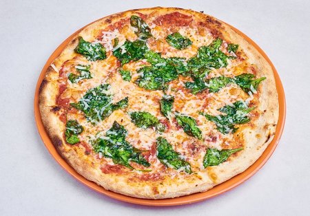 Sos pomidorowy, mozzarella fior di latte, szpinak marynowany w oliwie czosnkowej, parmezan