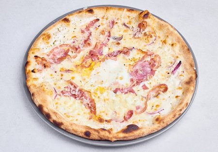 Sos czosnkowy, mozzarella fior di latte, boczek pancetta, cebula, jajko
