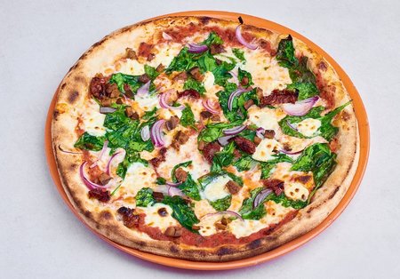 Sos pomidorowy, mozzarella fior di latte, bakłażan, ricotta cebula, suszone pomidory, szpinak