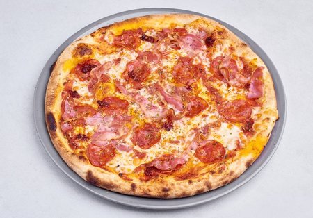 Sos pomidorowy, mozzarella fior di latte, 'nduja, salami napoli, boczek pancetta