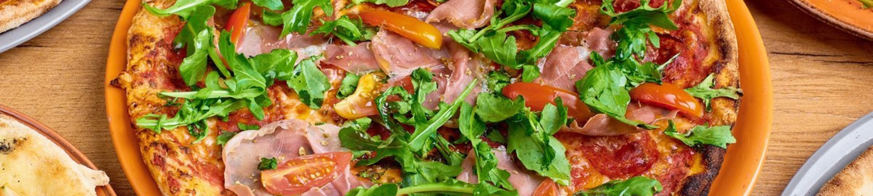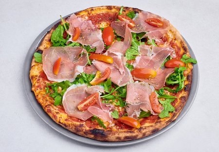 Sos pomidorowy, mozzarella fior di latte, szynka crudo (parmeńska),pikantne salami napoli, pomidorki cherry, rukola