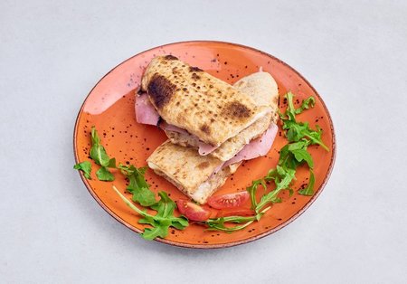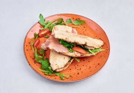 Mozzarella, szynka crudo, rukola, pomidorki cherry